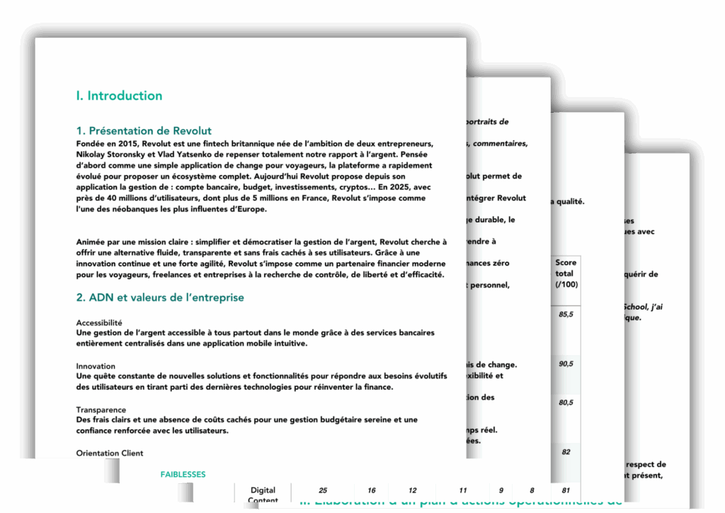 Pour répondre à cette problématique, ma démarche a débuté par une analyse complète du marché. J’ai réalisé une étude approfondie via les matrices SWOT et PESTEL pour comprendre l’environnement de Revolut. Simultanément, j’ai mené une veille concurrentielle pour évaluer le positionnement des acteurs directs comme N26, et indirects comme les applications de finance éthique. Cette première phase a été cruciale pour identifier une opportunité stratégique claire sur le segment de la « finance consciente ».